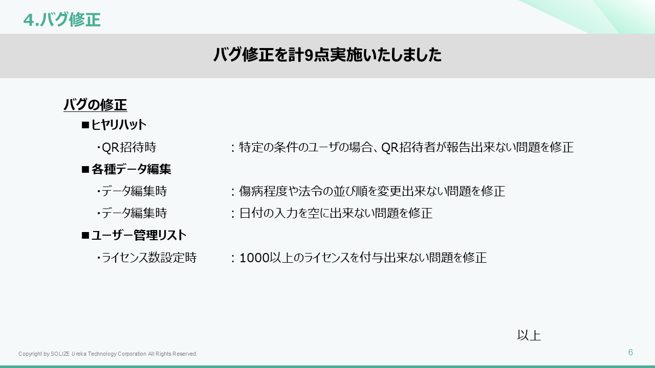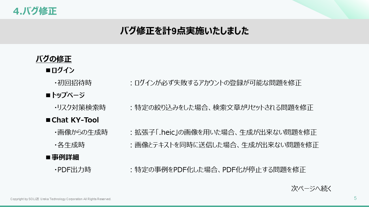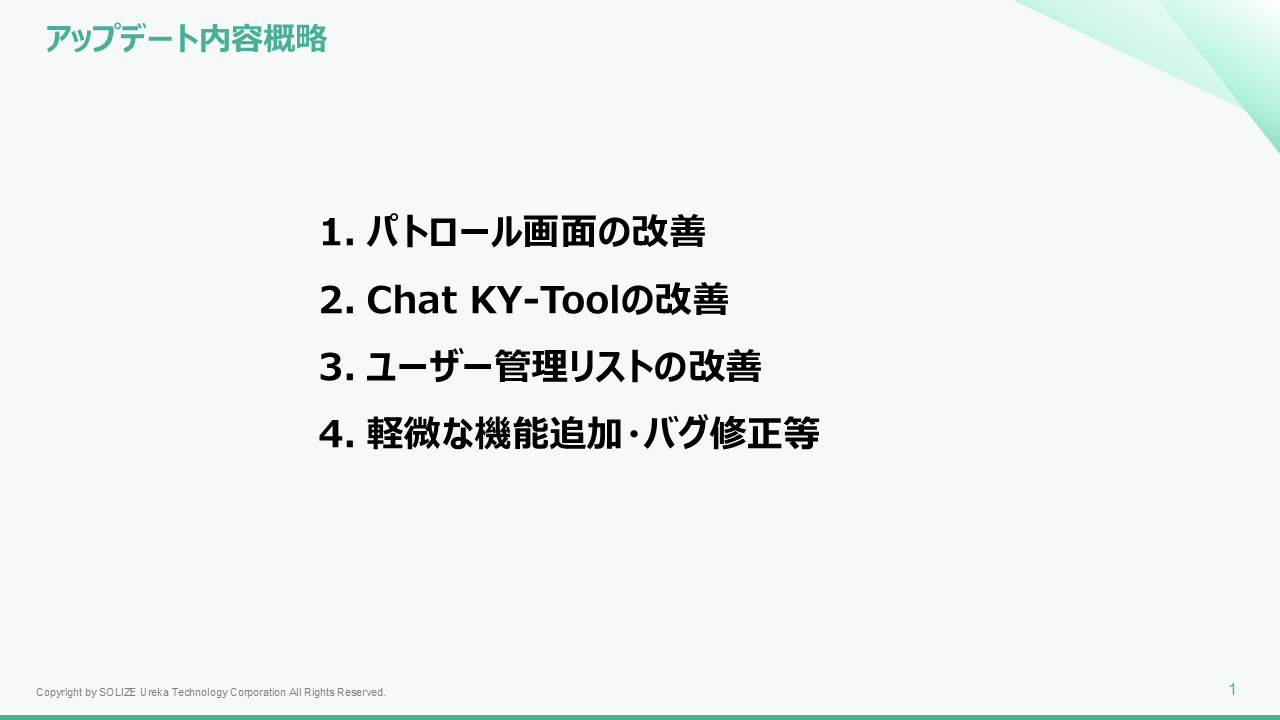 リリースノート_Ver3.11 2025年11月18日 02:50 更新 リリース日:11月18日(火)パトロール画面の改善Chat KY-Toolの改善ユーザー管理リストの改善軽微な機能追加・バグ修正等 Ver3.11リリースノート_02.pdf 1 MB ダウンロード 関連記事 リリースノート_Ver3.10.1 ログイン方法 Chat KY-Tool パトロール ツール概要説明
