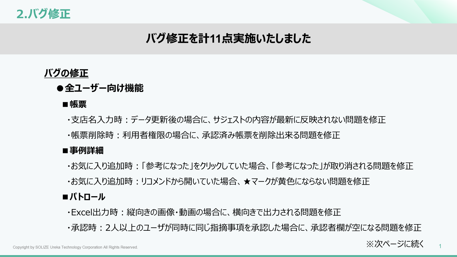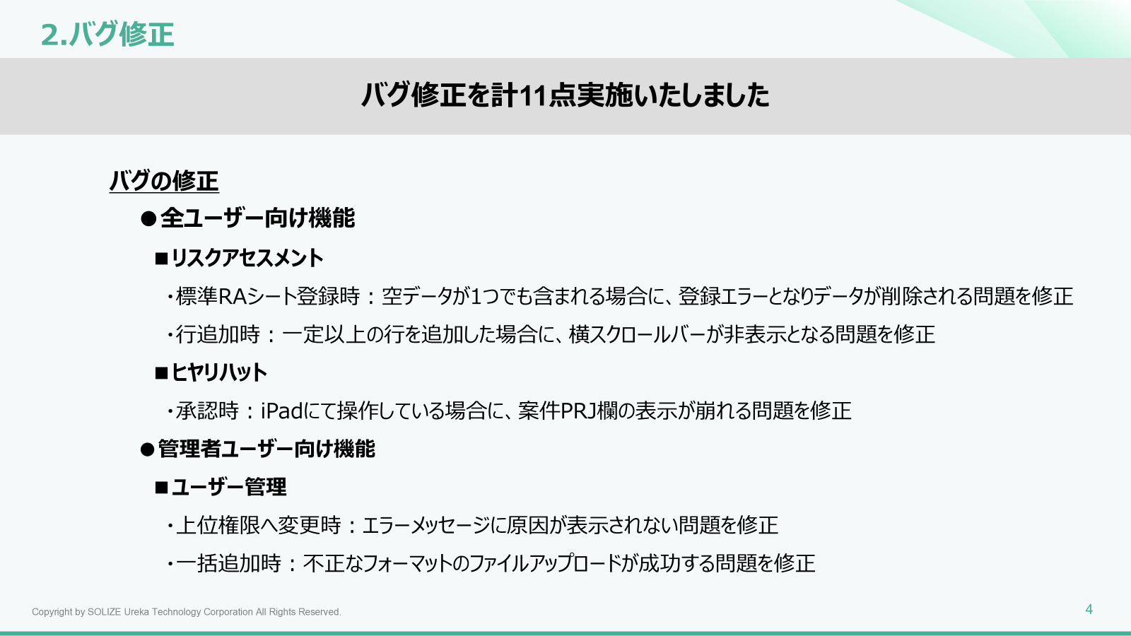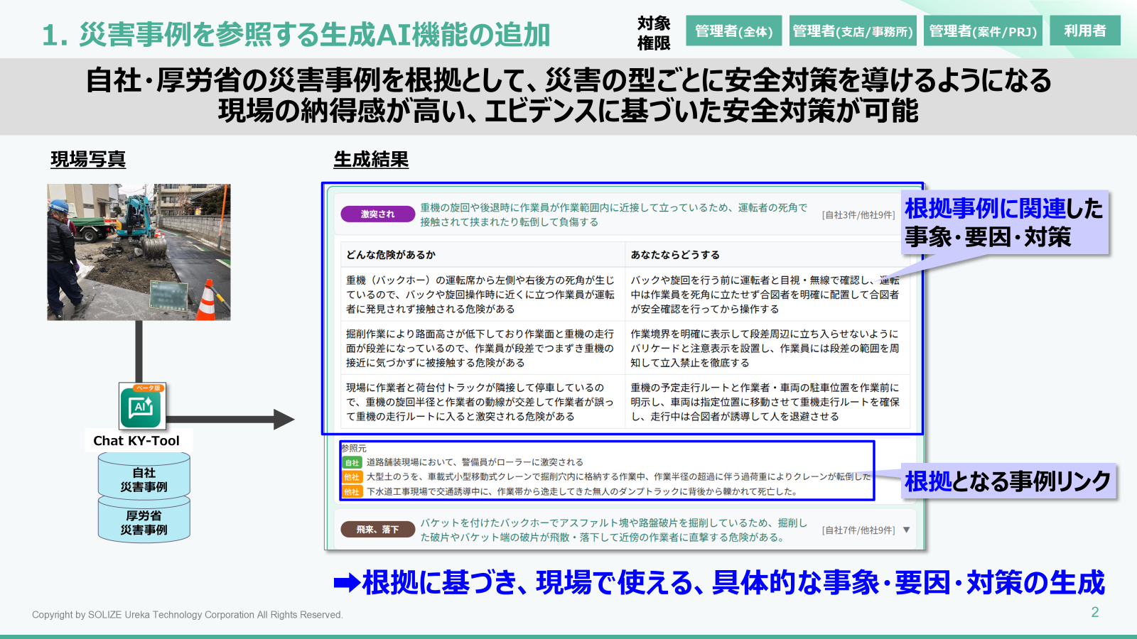 リリースノート_Ver3.13 2026年02月09日 11:43 更新 1. 災害事例を参照する生成AI機能の追加2. 軽微な機能追加・バグ修正等 Ver3.13リリースノート.pdf 800 KB ダウンロード 関連記事 リリースノート_Ver3.12 ログイン方法 Chat KY-Tool ヒヤリハット報告 お問い合わせ窓口のみ年末年始休業のお知らせ(25年12月27日(土)~26年1月4日(日))