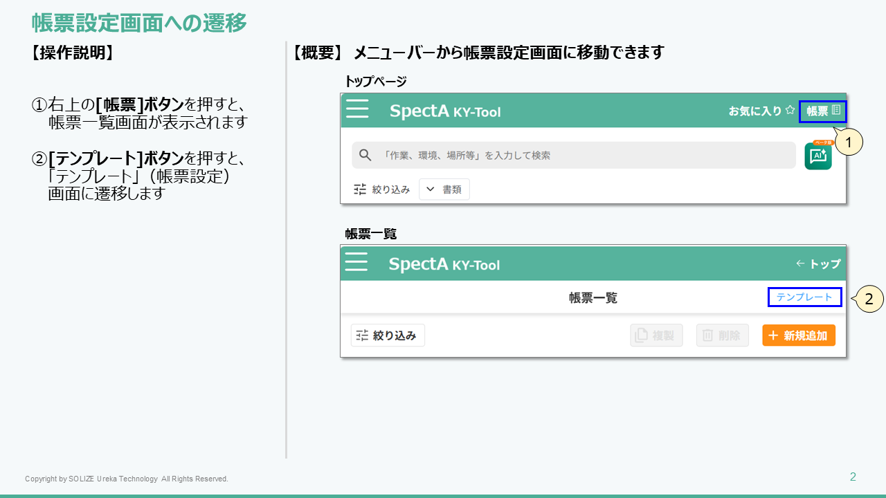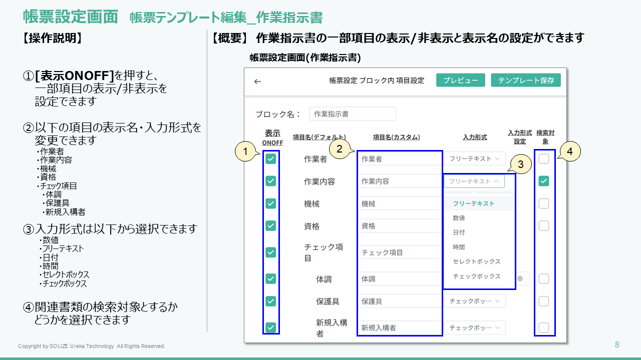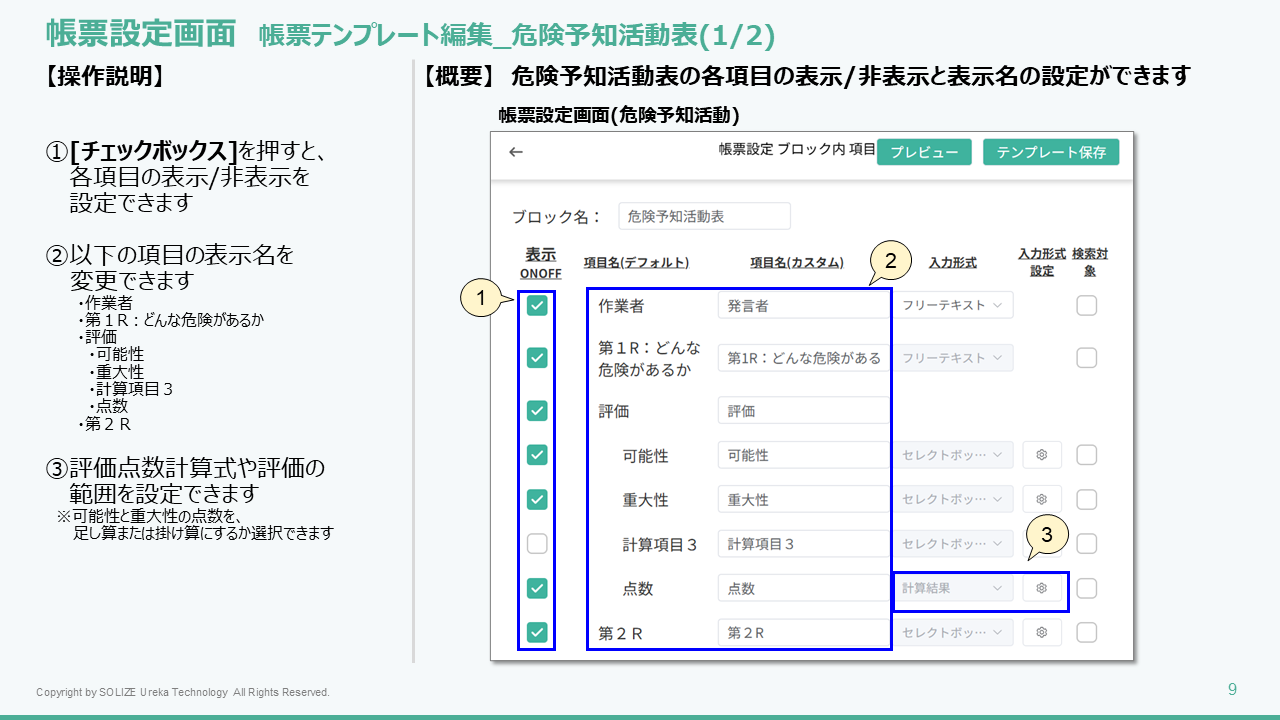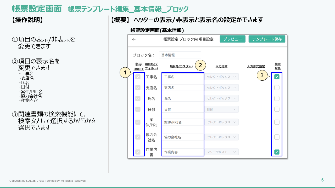 帳票設定 2025年08月04日 06:06 更新 1. 帳票設定画面への遷移2. 帳票テンプレート編集 2-1. 機能説明 2-2. 基本情報 2-3. 作業指示書 2-4. 危険予知活動表 2-5. 承認 帳票設定_250730.pdf 1 MB ダウンロード 関連記事 書類設定 帳票 各種データ編集 ツール概要説明 ヒヤリハット報告