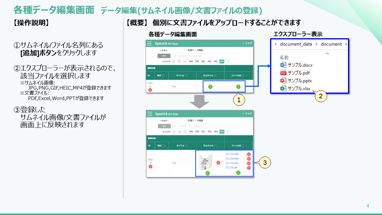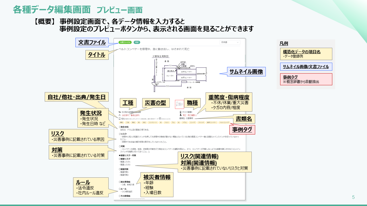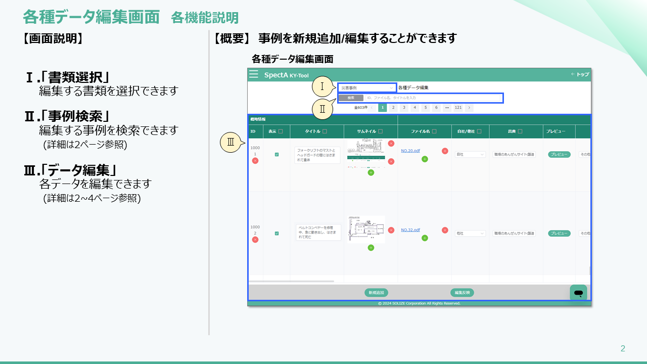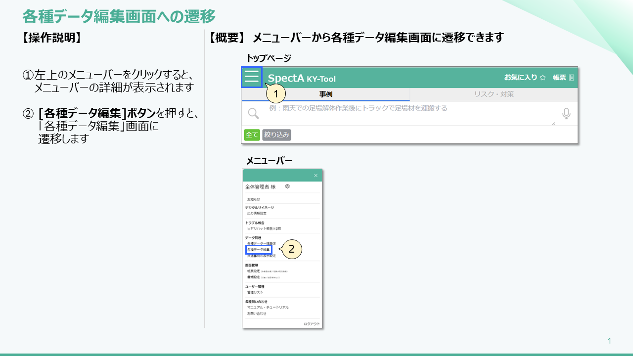 各種データ編集 2025年07月18日 10:25 更新 1. 各種データ編集画面への遷移2. データ編集(事例情報の記入)3. データ編集(サムネイル画像/文書ファイルの登録)4. プレビュー画面 各種データ編集_240902.pdf 700 KB ダウンロード 関連記事 ログイン方法 各種データ一括設定 ツール概要説明 管理リスト 「ヒヤリハット報告」における使い方